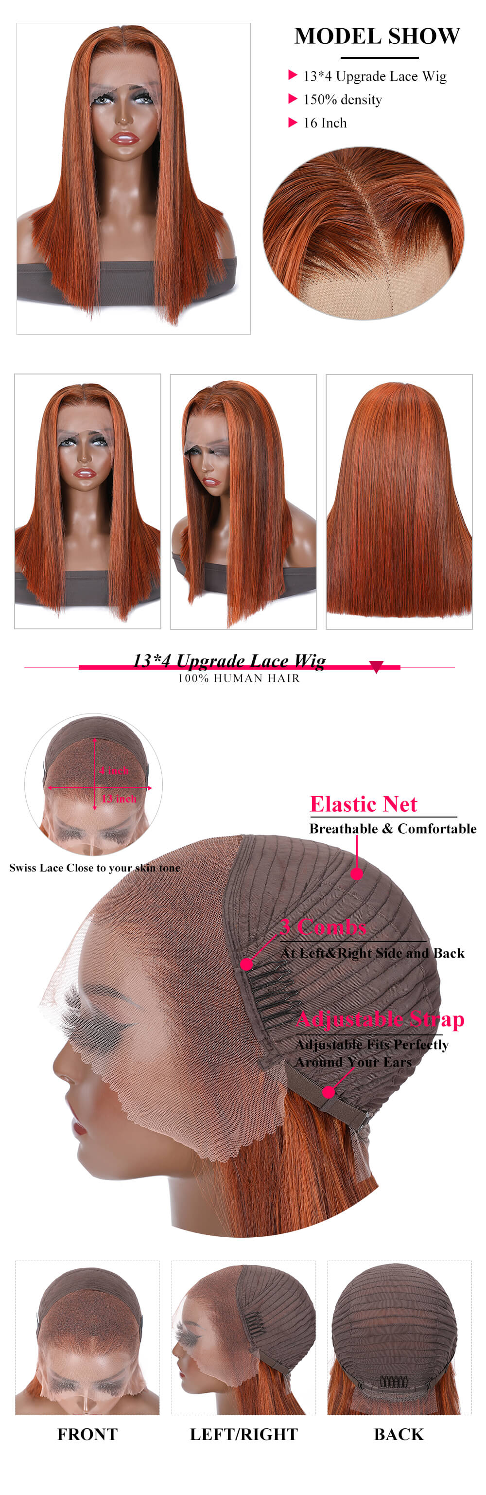 Hurela 13x4 Ginger Copper Red Highlight Straight Lace Front Human Hair Wigs With Baby Hair