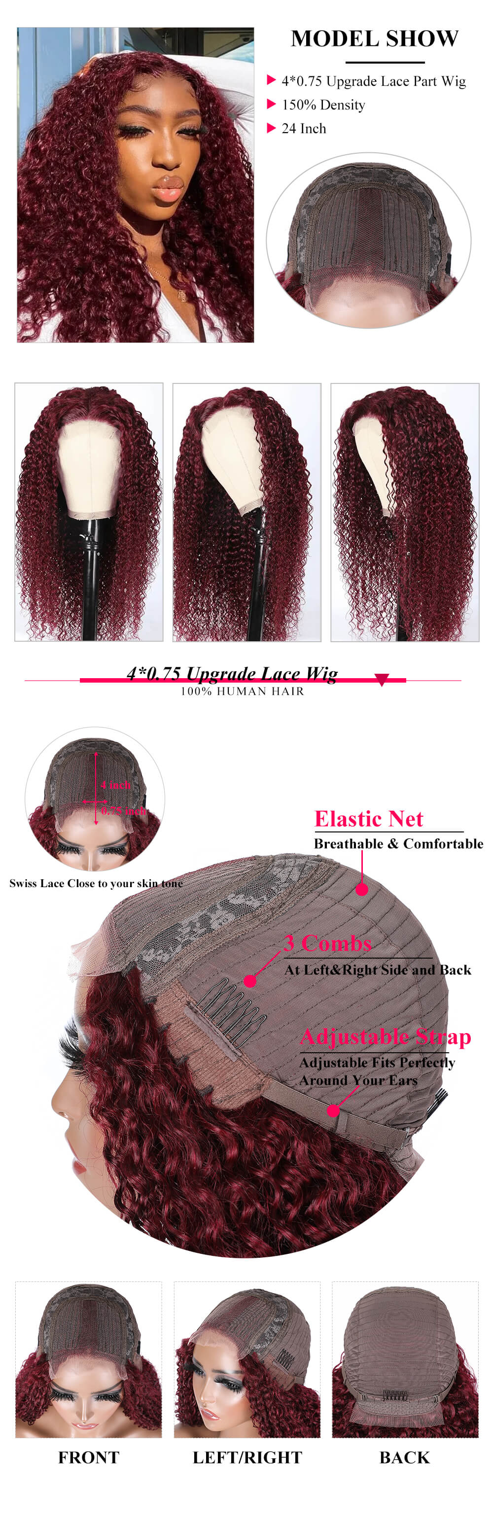 Hurela 4x4 Jerry Curly Lace Part Wig With 99J Burgundy Colored Wig 150% Density