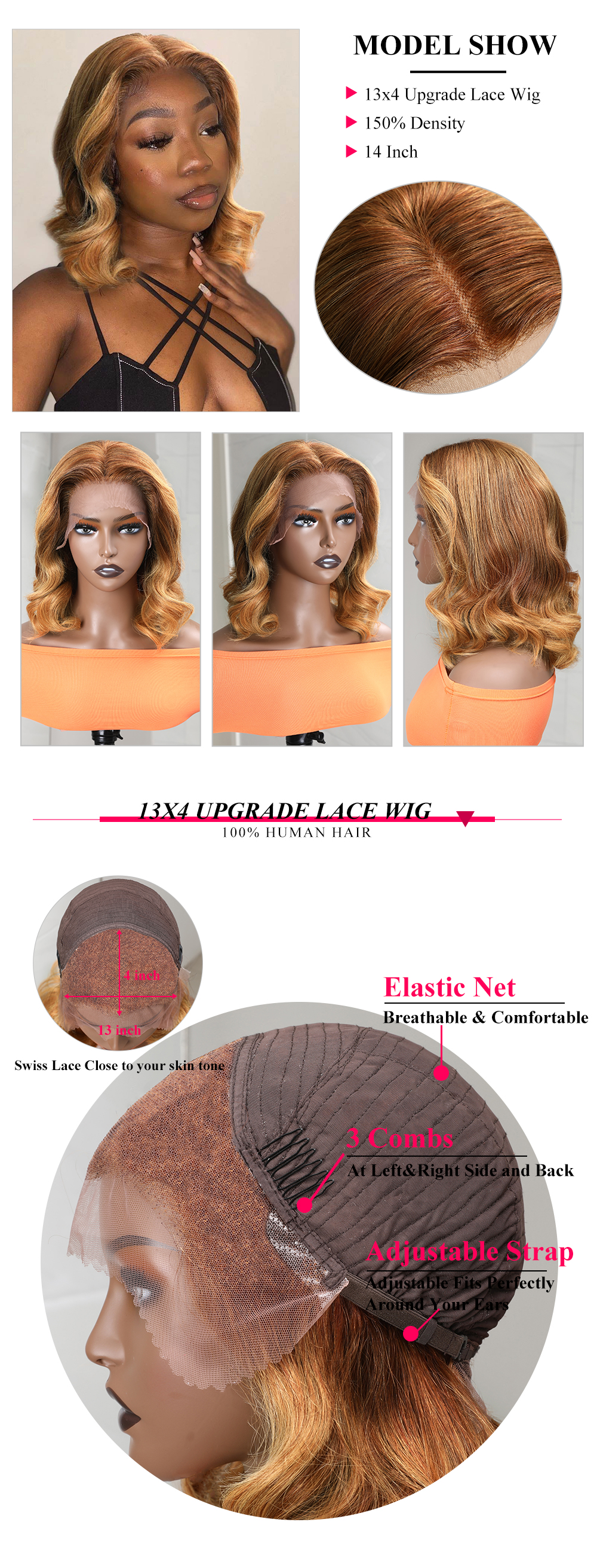 Hurela Blonde Balayage Highlights Color Celebrity Wave Bob Style Wigs 13x4 Lace Wigs 150% Density
