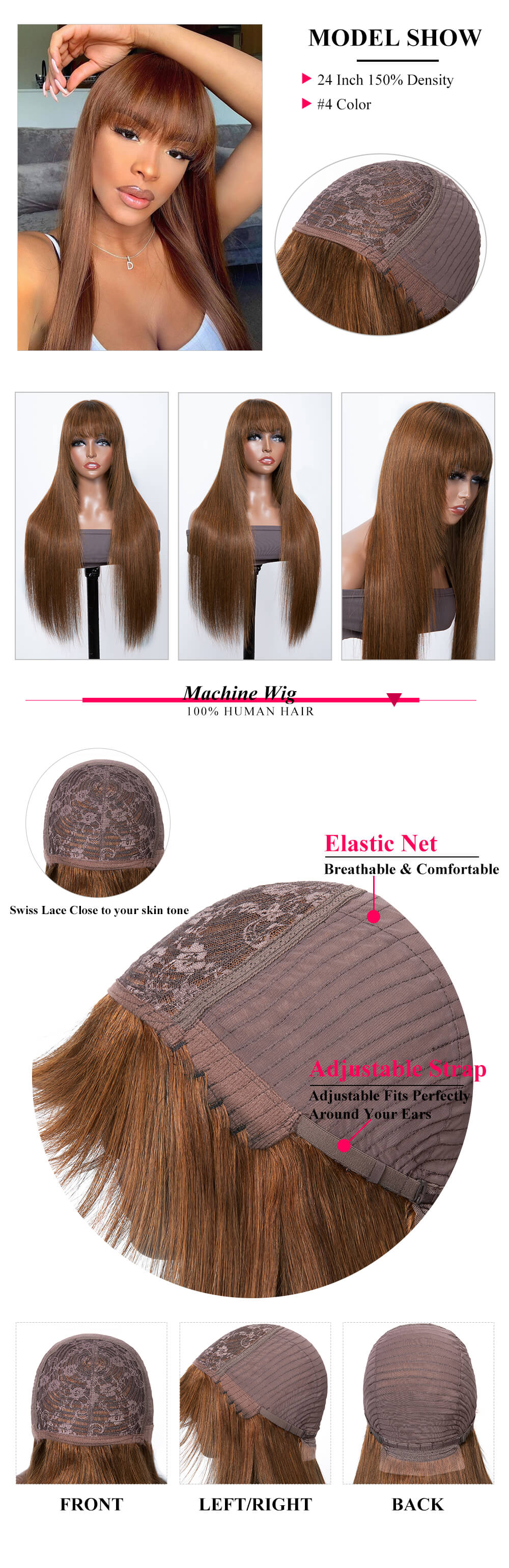 Hurela Cheap Dark Brown Hair Glueless Wigs Human Hair Colored Wigs With Bang Straight Hair Wig Bogo Free