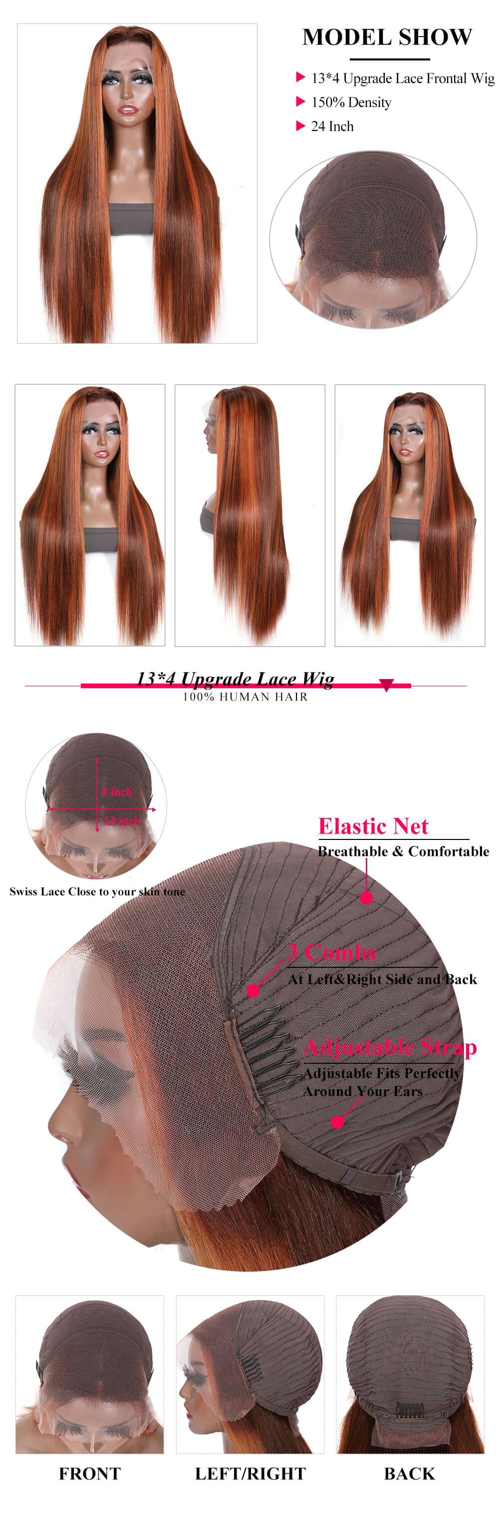 Hurela Ginger Copper Red Highlight Straight Wigs 13x4 Lace Frontal Wig With Natural Hairline