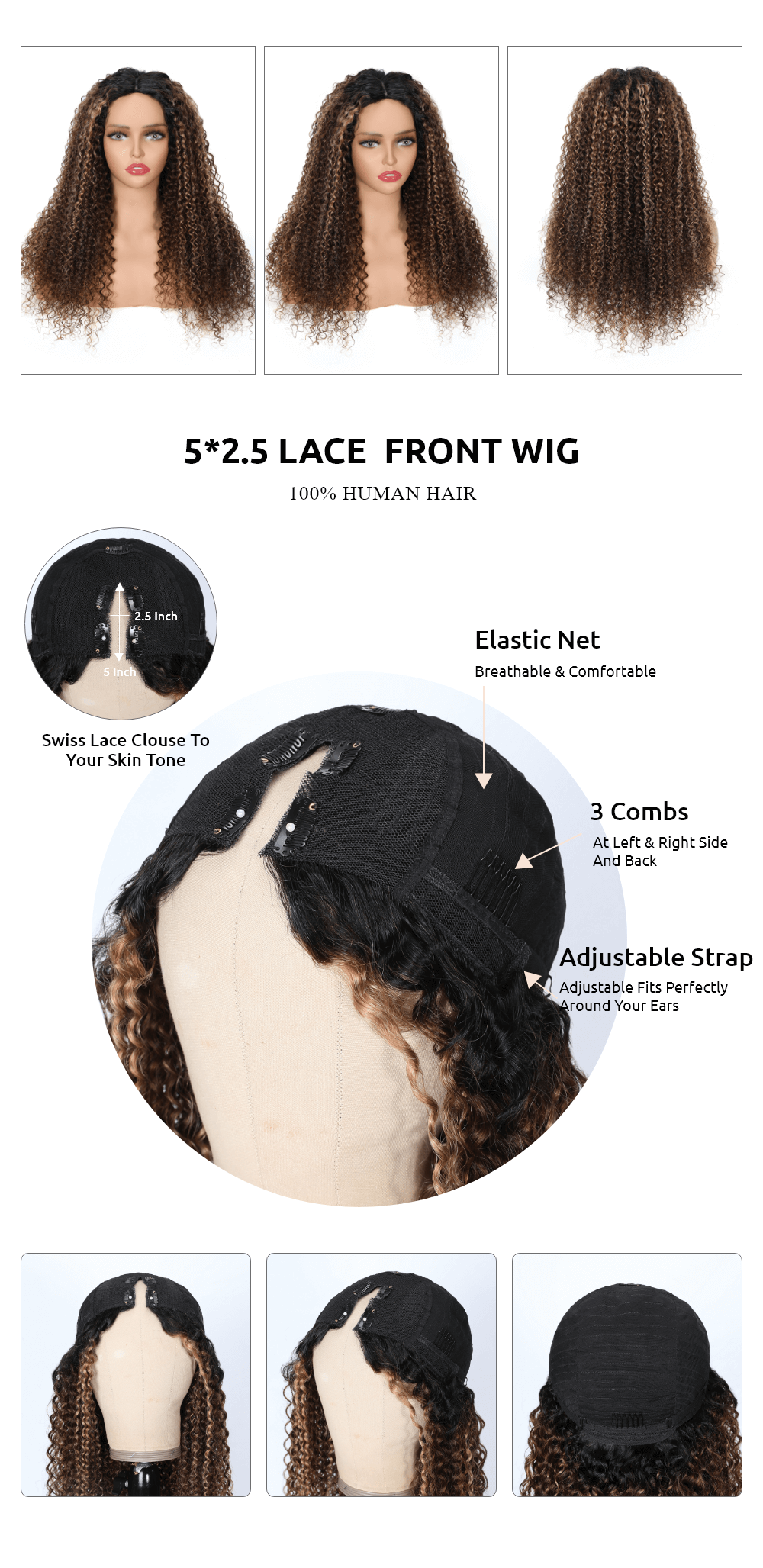 Hurela Glueless Jerry Curly Brown V Part Wig Beginner Friendly Honey Blond Highlight With Dark Roots