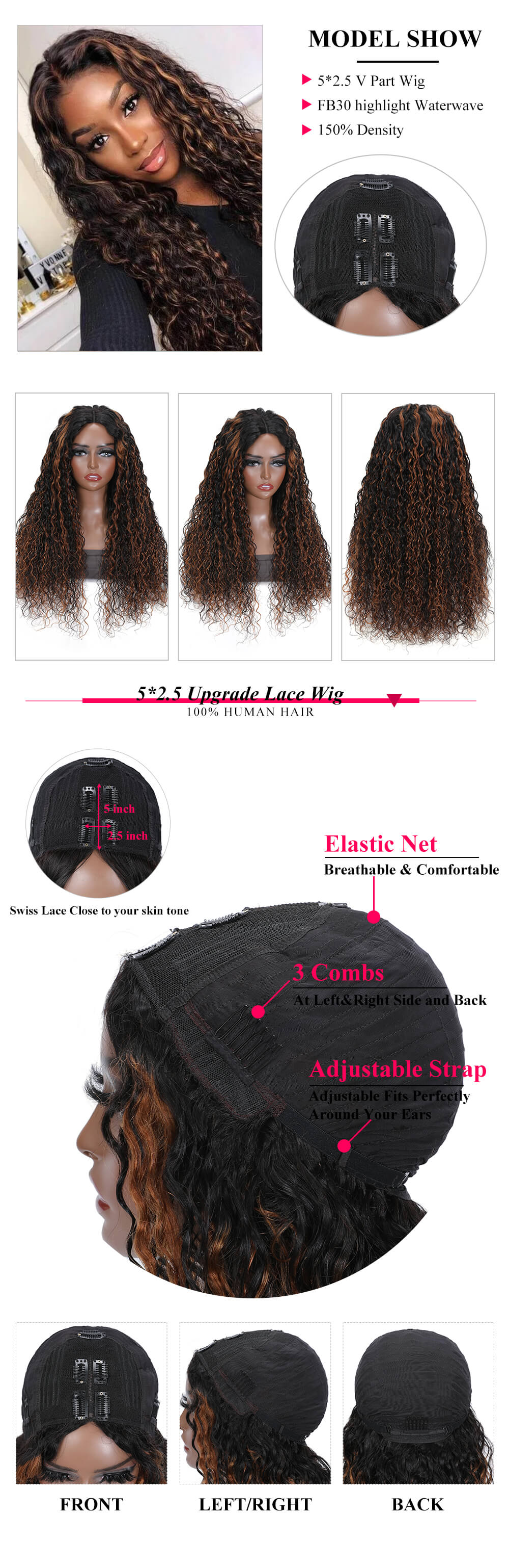 Hurela Ombre Highlights Color Water Wave V Part Human Hair Wig Middle Part Glueless Wigs 150% Density